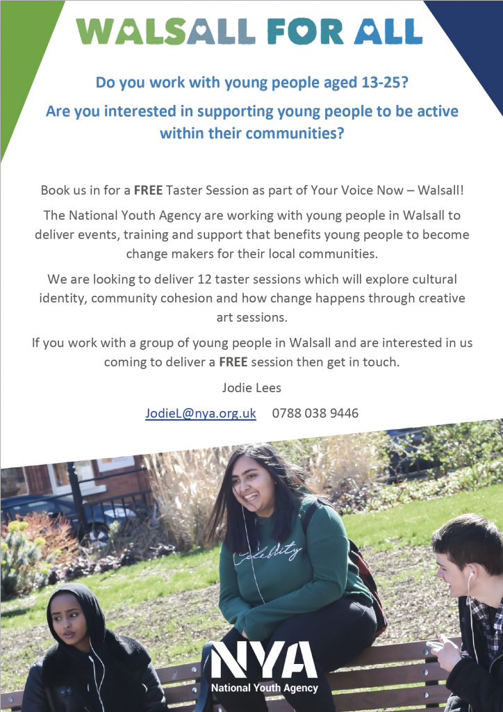 NYA Programme Devliery Manager, Jodie Lees, said ‘We are excited to be part of the cohort of partners who are delivering work within Walsall for All. Creating strong and integrated communities is vital in ensuring young people feel safe, valued and have the opportunity to reach their full potential. Your Voice Now will work with over 500 young people ensuring that their voice is heard throughout the programme and creating a lasting legacy for Walsall and its communities’